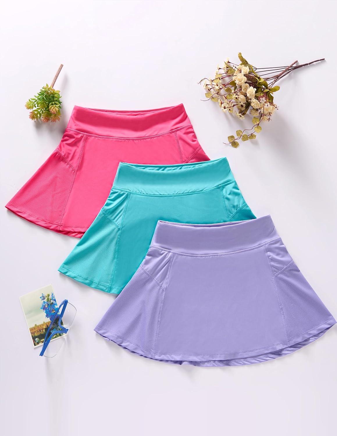 3 Pack Girls' Athletic Skirts with Built-in Shorts and Adjustable Waist, Youth Kids Skorts Tennis Golf Running(Aqua/Lilac/Hot Pink)